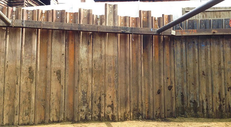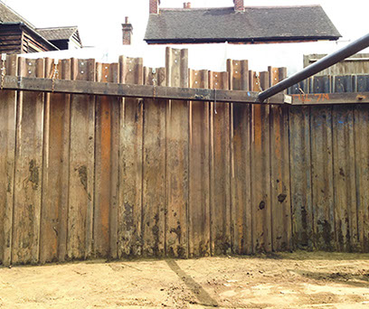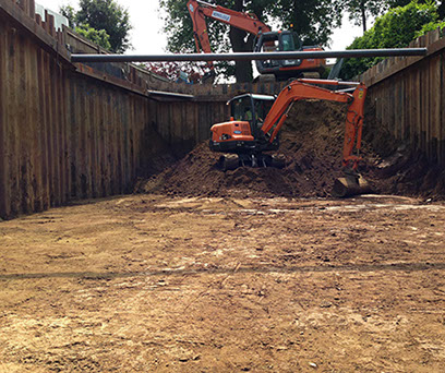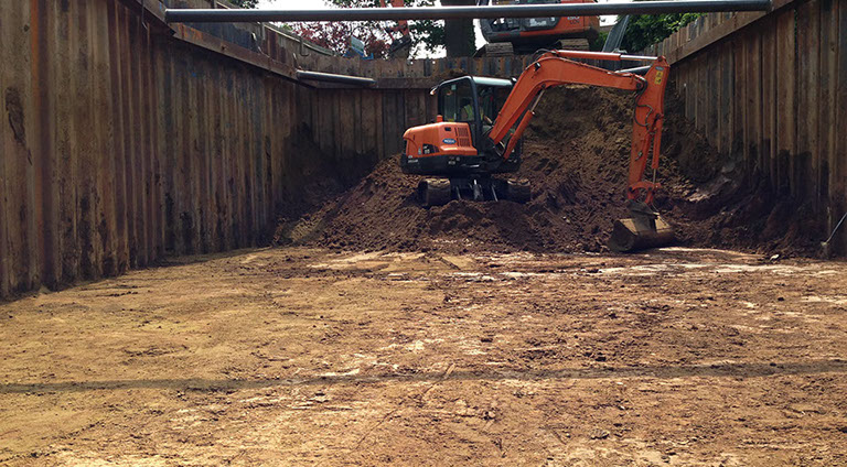 Coordinate soil investigation and design of the temporary works. Install Larssen Sheet Piles with EMV and install walers and struts with onsite welding. Provide de-watering solution, 1m below the local water table.