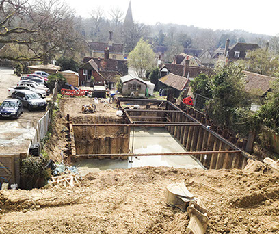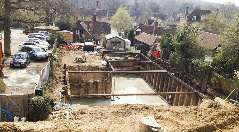 Bring together an experienced team of designers to explore the options for the superstructure. Concluded to use an insulated EPS raft with ICF walls using waterproof concrete. Temporary support with trench sheets supported by site fabricated whalers and struts.